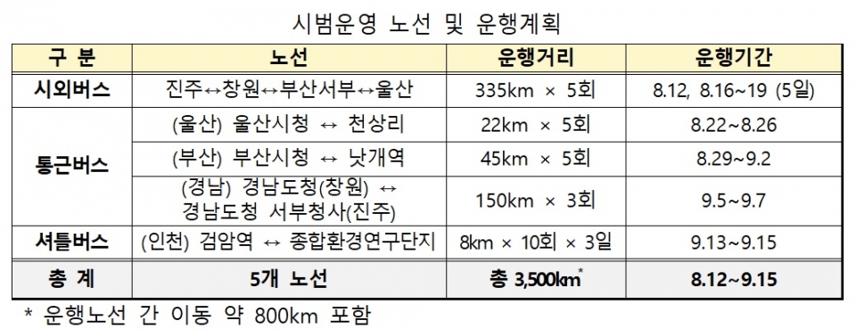 올해 하반기 정식 출시 전에 수소버스 1대를 제작사로부터 협조받아 부·울·경 시외버스 1개 노선, 통근버스 3개 노선, 셔틀버스 1개 노선 등 총 5개 노선에서 8월 12일부터 5주간 순차적으로 시범운행할 예정이다.