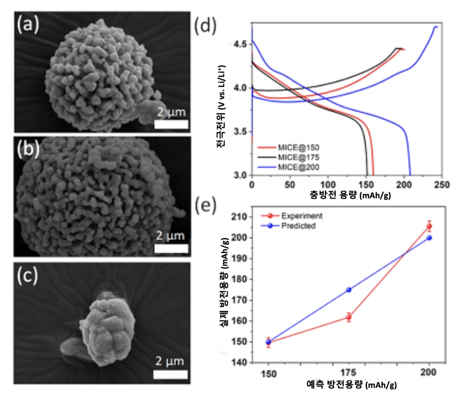 연구팀은 배터리 양극재 원료조성, 1차 및 2차 소결 온도와 시간 등의 공정 변수와 컷오프 전위 및 충․방전률과 같은 측정 변수, 그리고 1차 및 2차 입자의 크기와 같은 구조 변수, 마지막으로 충․방전 용량과 같은 성능 변수 간의 상관관계를 정량적으로 수립했고, 이를 활용해 요구되는 에너지 용량에 맞는 합성 조건을 찾는 알고리즘을 개발했다.