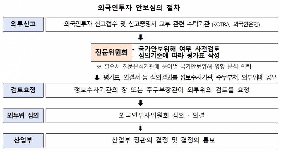 현행 안보심사절차는 심사대상 외투신고가 접수된 후, 주무부장관 혹은 정보수사기관장의 검토요청에 따라 외국인투자위원회가 심의를 거쳐 인수합병(M&A) 허가 및 제한 여부 등을 결정하도록 되어있다.