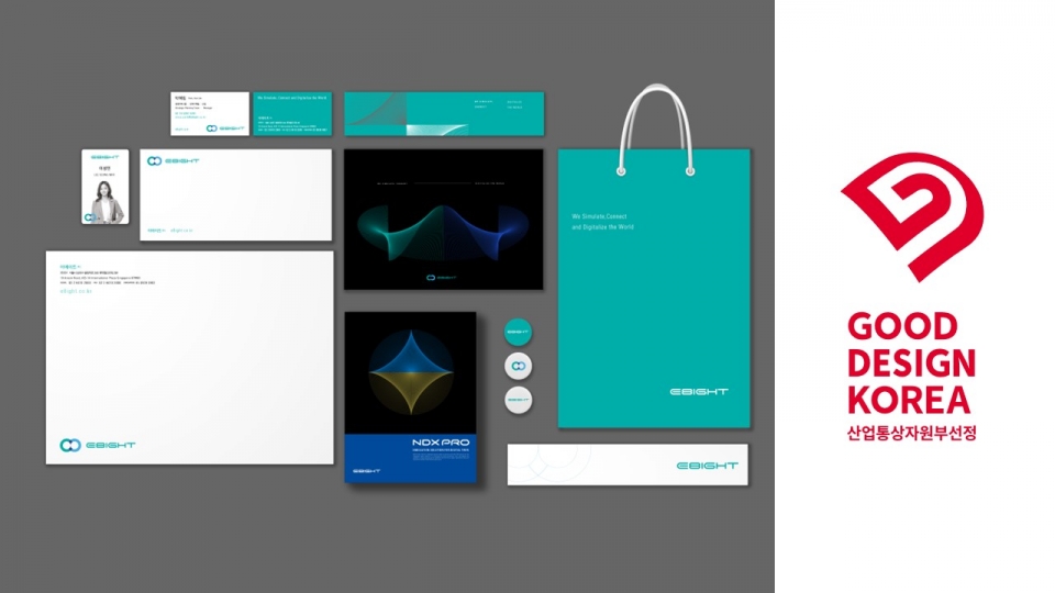 이번에 선정된 이에이트 통합 아이덴티티 시스템은 기존 세계와 가상 세계를 연결하는 디지털 트윈을 기업로고, 심볼, 제품 브랜드 디자인 등 각 요소가 유기적인 연관성을 가질 수 있도록 시각화 된 것이 특징이다. 특히 대중들에게 다가가기 어려운 무형의 요소인 디지털 트윈과 시뮬레이션 기술을 365개의 선을 조합해 직관적으로 표현했다.