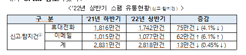 이는 전기 대비 음성 스팸은 0.01통, 문자 스팸은 0.02통 감소한 것으로, 이메일 스팸 수신량은 하루 평균 0.15통으로 전년 하반기 대비 0.02통 늘어난 것으로 조사됐다.