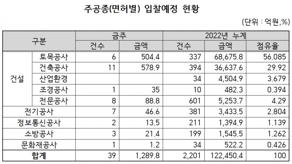 한편 금주 입찰공사 중 경상남도 양산시 수요 ‘종합복지허브타운 건립공사(추정가격 303억원)’는 양산시 물금읍 가촌리에 지하 1층·지상 5층 규모의 종합복지시설을 건설하는 사업이다.