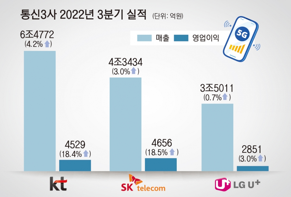 KT는 한국채택국제회계기준(K-IFRS) 2022년 3분기 연결 기준 매출이 전년 동기 대비 4.2% 증가한 6조4772억원, 영업이익은 18.4% 증가한 4529억원을 기록했다고 밝혔다.