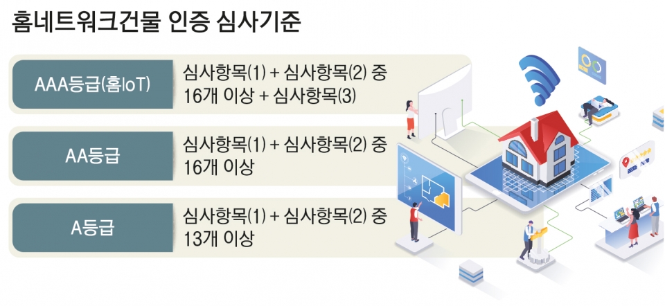 현행 홈넷건물 인증 심사기준은 AAA등급(홈IoT), AA등급, A등급 등 3가지 종류로 구성된다.