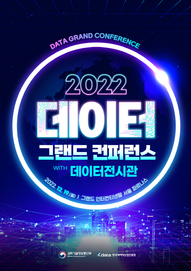 과학기술정보통신부(장관 이종호)가 주최하고 한국데이터산업진흥원(원장 윤혜정)이 주관하는 ‘2022 데이터 그랜드 컨퍼런스 with 데이터전시관’이 19일 그랜드 인터컨티넨탈 서울 파르나스 그랜드볼룸에서 개최된다.