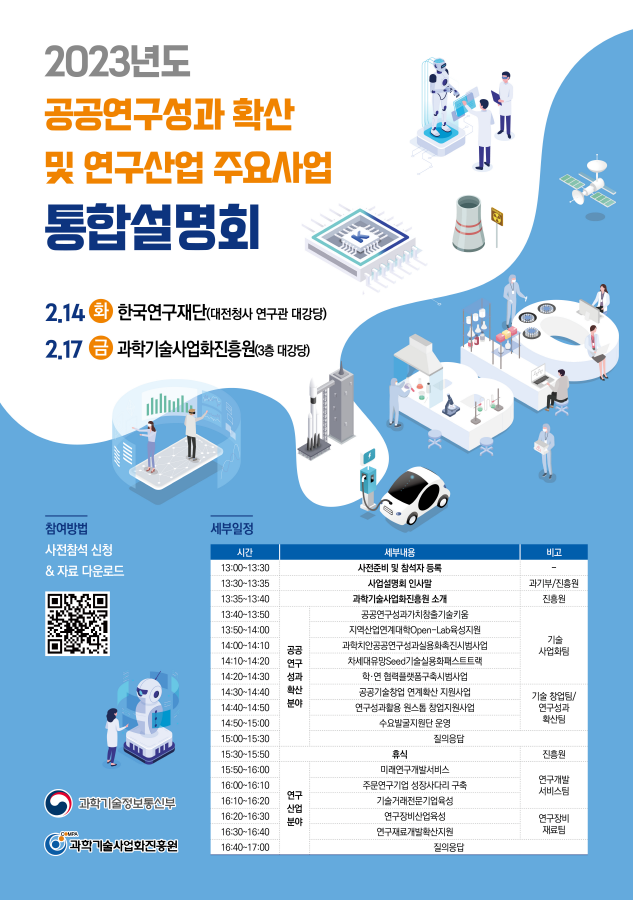 과학기술정보통신부와 과학기술사업화진흥원은 14일, 17일 양일에 걸쳐 연구성과 실용화 촉진 및 연구산업 육성을 위한 ‘2023년도 공공연구성과 확산 및 연구산업 주요사업’에 대한 통합 설명회를 개최한다고 밝혔다.