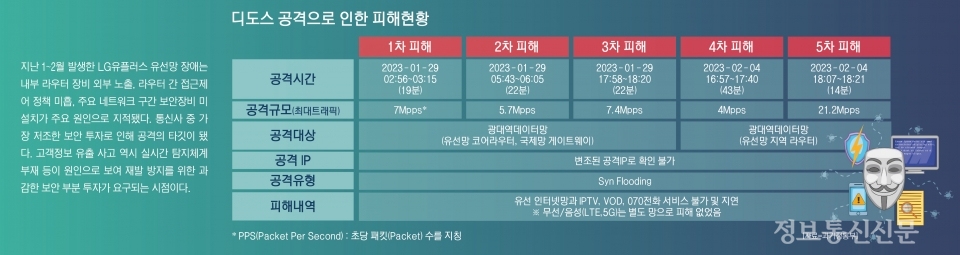 연초 발생했던 LG유플러스 유선망 장애는 내부 라우터 장비 외부 노출, 라우터 간 접근제어 정책 미흡, 주요 네트워크 구간 보안장비 미설치가 주요 원인으로 지적됐다. 통신사 중 가장 저조한 보안 투자로 인해 공격의 타깃이 됐다. 고객정보 유출 사고 역시 실시간 탐지체계 부재 등이 원인으로 보여 재발 방지를 위한 과감한 투자가 요구되는 시점이다.