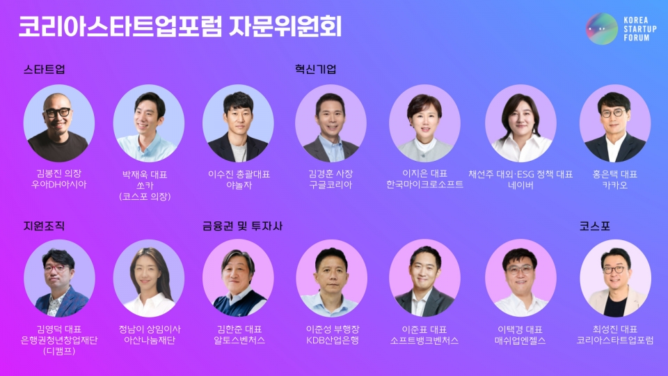코스포는 향후 비전과 활동을 함께 논의할 자문위원회를 신설하고 스타트업을 대표하는 단체로서 역할을 강화해 나가기로 했다. 이를 위해 스타트업 창업가를 비롯해 지원기관, 투자사, 글로벌 기업, 금융권 등 다양한 분야의 생태계 리더 14명을 자문위원으로 위촉했다. 창업가는 김봉진 우아DH아시아 의장, 박재욱 쏘카 대표(코스포 의장), 이수진 야놀자 총괄대표가 참여한다. 생태계에서는 김경훈 구글코리아 사장, 김영덕 은행권청년창업재단(디캠프) 대표, 김한준 알토스벤처스 대표, 이준성 KDB산업은행 부행장, 이준표 소프트뱅크벤처스 대표, 이지은 한국마이크로소프트 대표, 이택경 매쉬업엔젤스 대표, 정남이 아산나눔재단 상임이사, 채선주 네이버 대외·ESG 정책 대표, 홍은택 카카오 대표이사가 힘을 보태고 최성진 코스포 대표도 함께 한다.