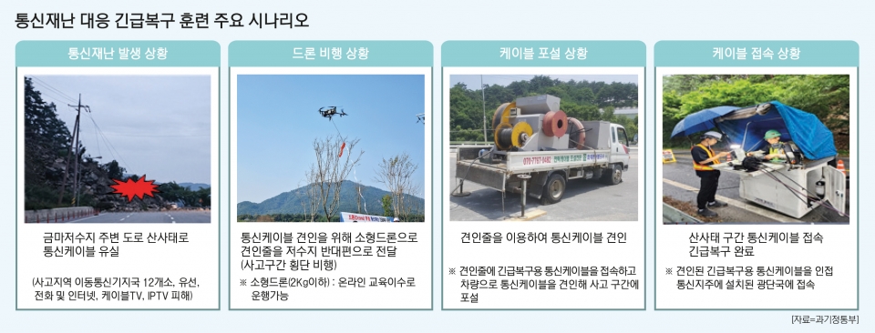 현장 사례와 이번 훈련을 통해 집중호우에 의한 산사태, 지반침하 등으로 인력과 장비 진입이 어려운 지역에 드론으로 통신케이블 인계선을 사고구간 횡단비행을 통해 전달해 통신케이블을 견인하고 포설할 수 있어, 통신서비스 장애지역의 긴급복구 시간을 4분의 1로 대폭 감소시킬 수 있으며 작업자의 안전성도 확보할 수 있는 것으로 확인됐다.