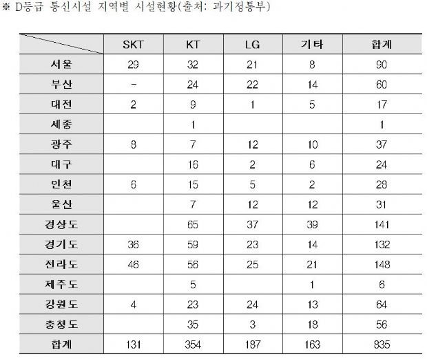 국회 과학기술정보방송통신위원회 노웅래 위원장이 27일 과기정통부로부터 제출받은 “D등급 통신시설 지역별 시설현황”에 따르면 각 통신사별로 보유한 D급 통신시설은 KT가 354곳, LG유플러스가 187곳, SK텔레콤이 131곳으로 드러났다.