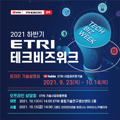 한국전자통신연구원(ETRI)는 13일과 15일 양일간, 각 대전지역과 서울지역에서 ‘2021 하반기 ETRI 테크비즈위크 기술상담회’를 개최한다고 밝혔다.