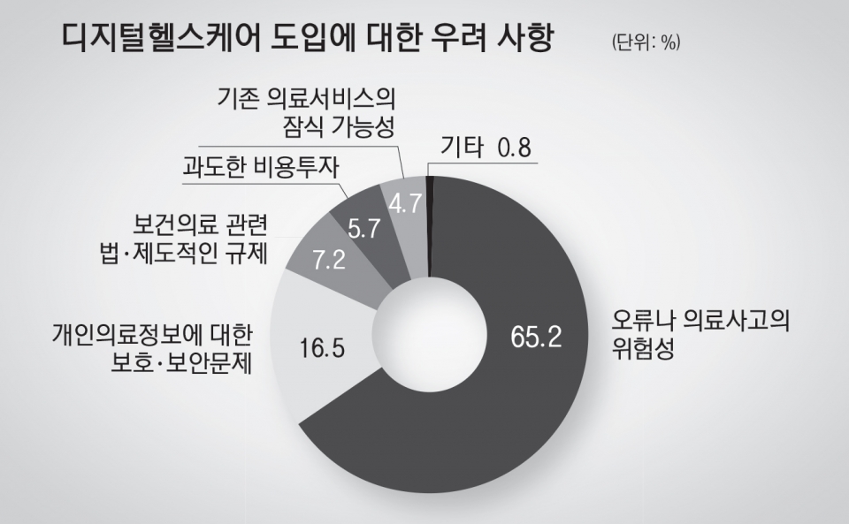 설문에 참여한 의료인은 디지털헬스케어 활용의 기대효과로 환자 편리성 향상(27.5%), 업무효율성 향상(18.5%), 임상적 판단 신뢰도 및 정확도 향상(12.8%) 순으로 높게 응답했으며, 디지털헬스케어 도입에 있어 우려사항은 오류나 의료사고 위험성(65.2%), 개인정보 보호·보안 문제(16.5%), 법·제도 위반·제제 가능성(7.2%) 순으로 응답했다.