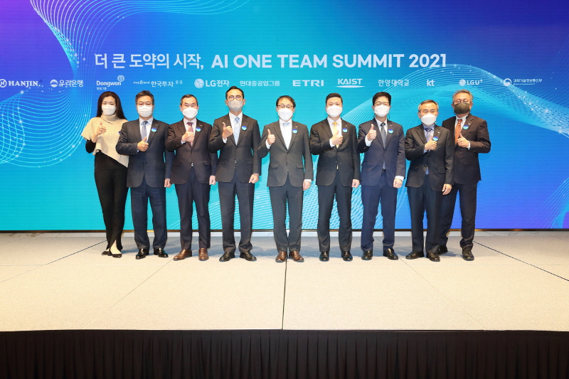 KT는 10일 서울 송파구에 위치한 소피텔 엠배서더 호텔에서 AI 원팀 11개 참여기관들과 함께 ‘AI 원팀 서밋(Summit) 2021’을 개최했다고 밝혔다.