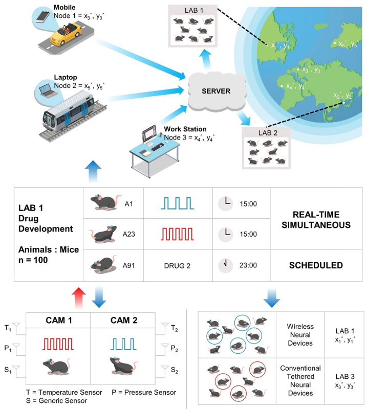 연구팀은 사물인터넷(IoT) 기술을 접목해 다양한 다수의 뇌 이식용 기기들을 인터넷 원격으로 동시 제어하거나 예약된 스케줄에 따라 기기들이 자동으로 구동되도록 하는 무선 네트워크 시스템을 개발했다. 이를 통해 시간과 장소에 상관없이 목표 동물들의 특정 뇌 회로를 원격 제어하는 것을 가능하게 했다. 이 시스템은 사용자가 인터넷 웹사이트 기반의 무선 네트워크 플랫폼을 통해 뇌 이식용 장치의 원격제어, 자동화된 데이터 수집, 뇌 회로 제어 스케줄링 등의 다양한 기능을 손쉽게 구현할 수 있도록 설계됐다.