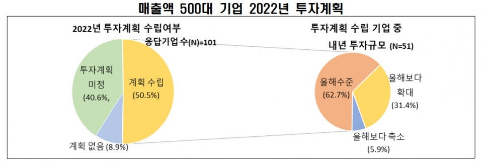최근 한국경제연구원이 여론조사기관 모노리서치에 의뢰해 매출액 500대 기업을 대상으로 ‘2022년 투자계획’(101개사 응답)을 조사한 결과, 응답기업의 49.5%가 내년도 투자계획이 없거나(8.9%) 아직 계획을 세우지 못했다(40.6%)고 응답했다.