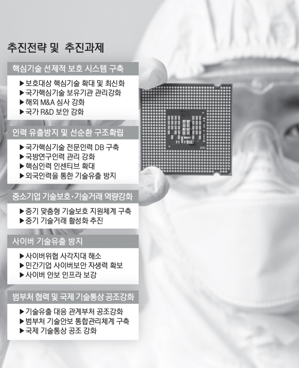이에 정부는 글로벌 기술보호 환경 변화에 대응해 핵심기술이나 인력의 해외유출을 방지할 수 있는 선제적이고 전략적 보호장치의 필요성을 절감하고, 부처별로 개별적으로 수립·시행해온 보호대책을 ‘우리기술 보호 전략’이라는 큰 틀로 통합해 범부처 대응 체계를 마련키로 했다.