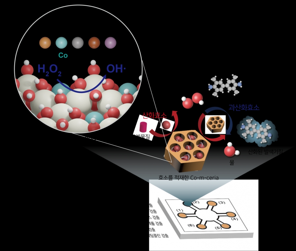공동연구팀은 기존의 과산화효소 모방 나노자임들과 달리 중성에서 활성을 지니며 큰 기공(구멍)을 가져 산화효소를 적재할 수 있는 코발트가 도핑된 메조 다공성 구조의 산화 세륨을 개발했다. 이어 이를 이용해 질병 진단물질인 글루코오스, 아세틸콜린, 콜레스테롤을 비롯한 6개의 물질을 동시에 검출 가능한 종이 센서를 개발했다.