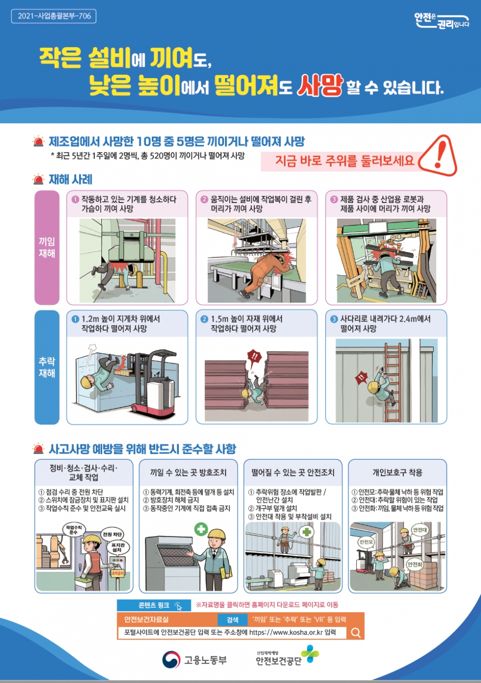 고용노동부는 광역·기초 지자체에 직접 수행하는 사업 및 발주공사의 현장 안전조치 상황과 안전보건관리체계 구축·운영상태에 대해 점검을 실시할 것을 요청하고, 자율점검표를 배포했다.