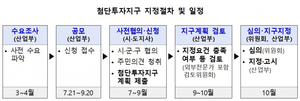 산업통상자원부는 ‘성장지향 산업전략’의 적극적 추진을 위해 첨단기업의 집적화를 유도하는 ‘첨단투자지구’의 최초 지정을 위한 공모를 실시한다고 밝혔다. 공모기간은 이달 21일부터 9월20일까지다.