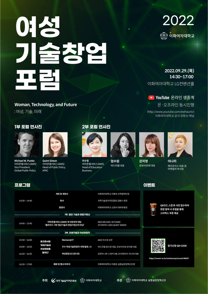 이화여자대학교와 과학기술일자리진흥원이 주최하고, 이화여대 실험실창업혁신단이 주관하는 이번 포럼에서는 여성 기술 기업인들의 새로운 혁신 서비스 창조를 위해 아마존웹서비스(AWS)의 클라우드 기술 사용 사례를 소개한다. 또한 선배 여성 기술창업 기업인들의 경험과 노하우를 공유하는 자리도 함께 마련된다.