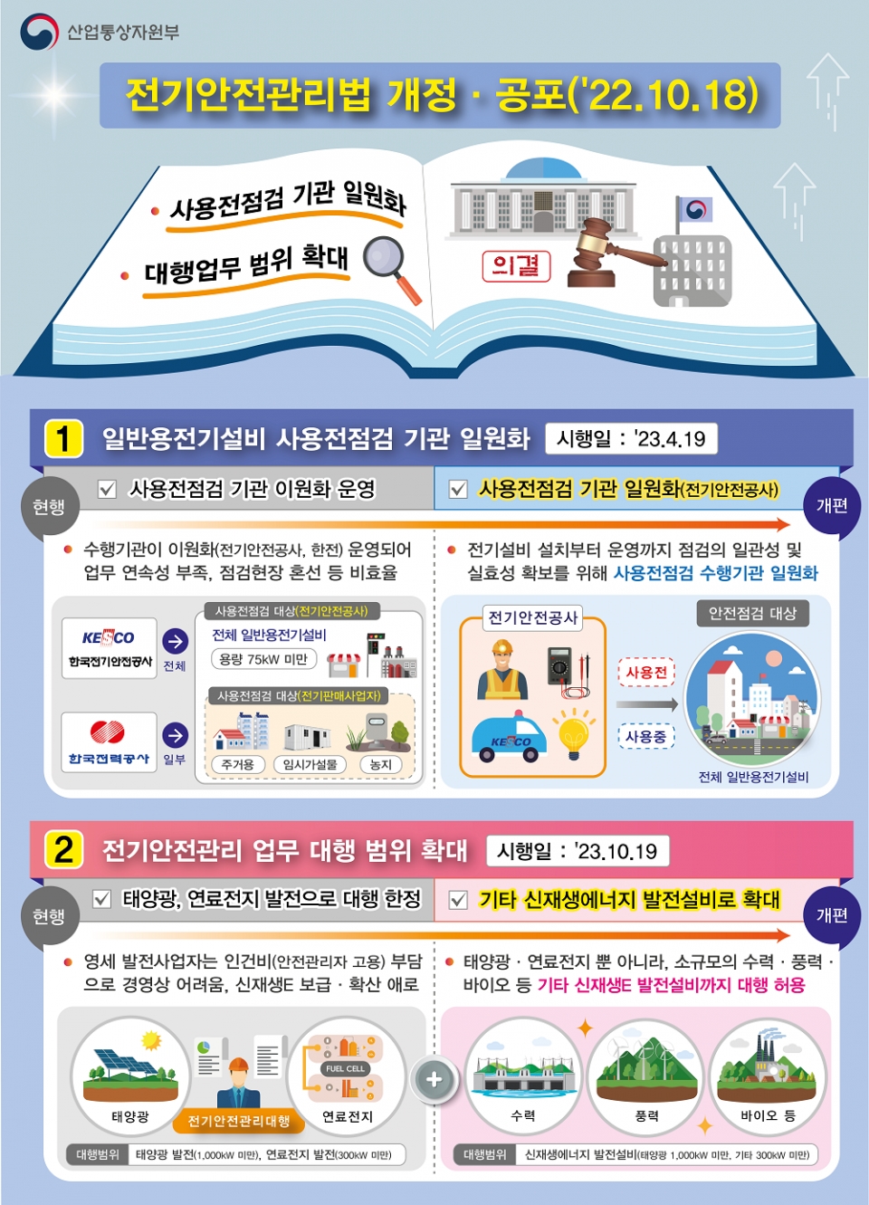 산업통상자원부는 전기안전관리체계를 개선하기 위한 ‘전기안전관리법’ 일부개정법률안이 10월 18일 공포됐다고 밝혔다.