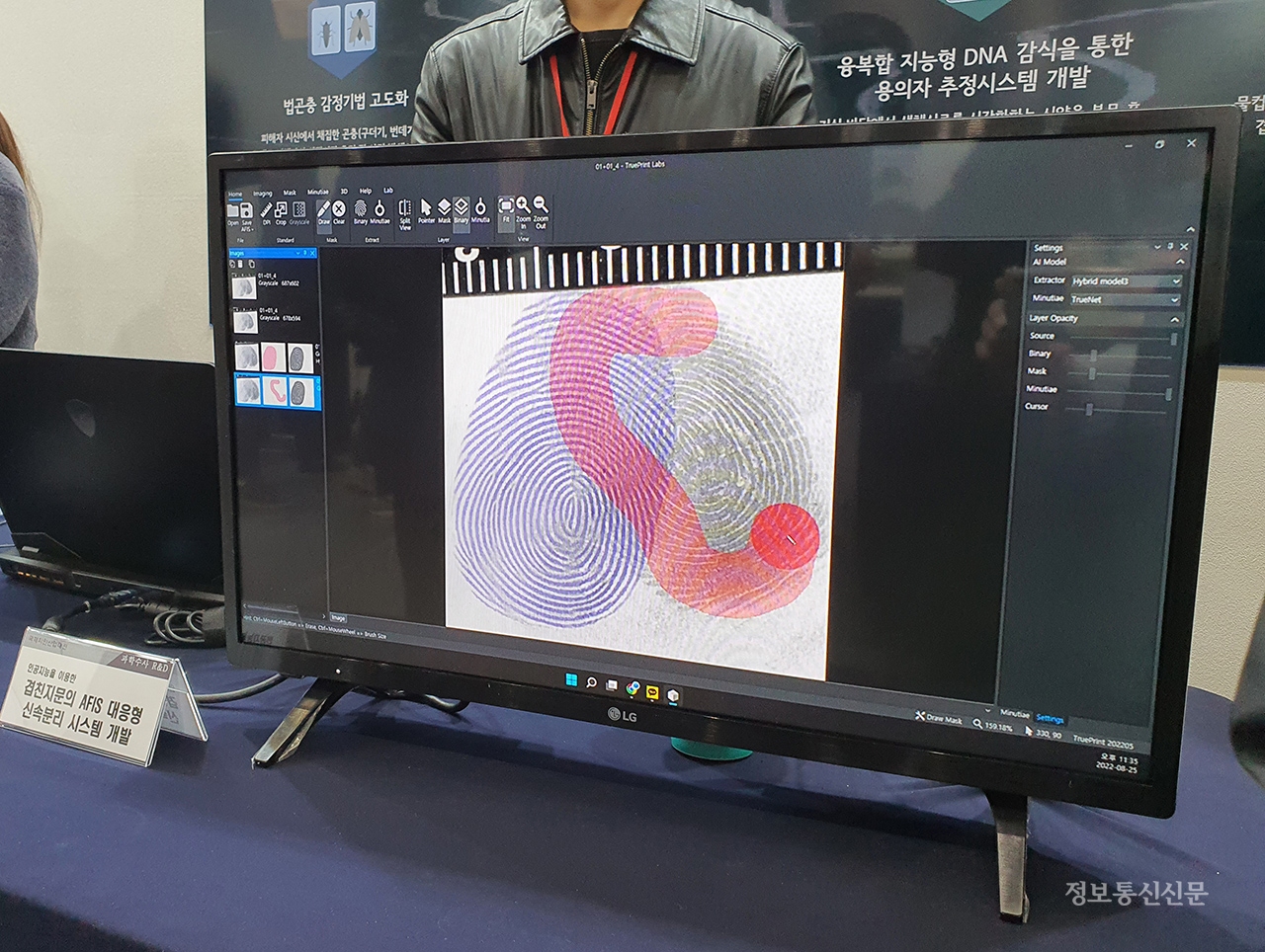윤희근 경찰청장이 ICT 융복합 치안 솔루션을 살펴 보고 있다. 현대자동차 부스에서 설명을 듣고 있는 윤희근 경찰청장. 경찰이 지문감식장비 사용법을 시연하고 있다. 지문감식장비를 통해 물체에 찍힌 지문을 확인할 수 있다. 인공지능(AI) 기술을 활용해 겹쳐있는 지문을 각각 분리할 수 있는 기술이 출품됐다. 국제치안산업대전 행사 안내 로봇이 곳곳에서 운행되고 있다.