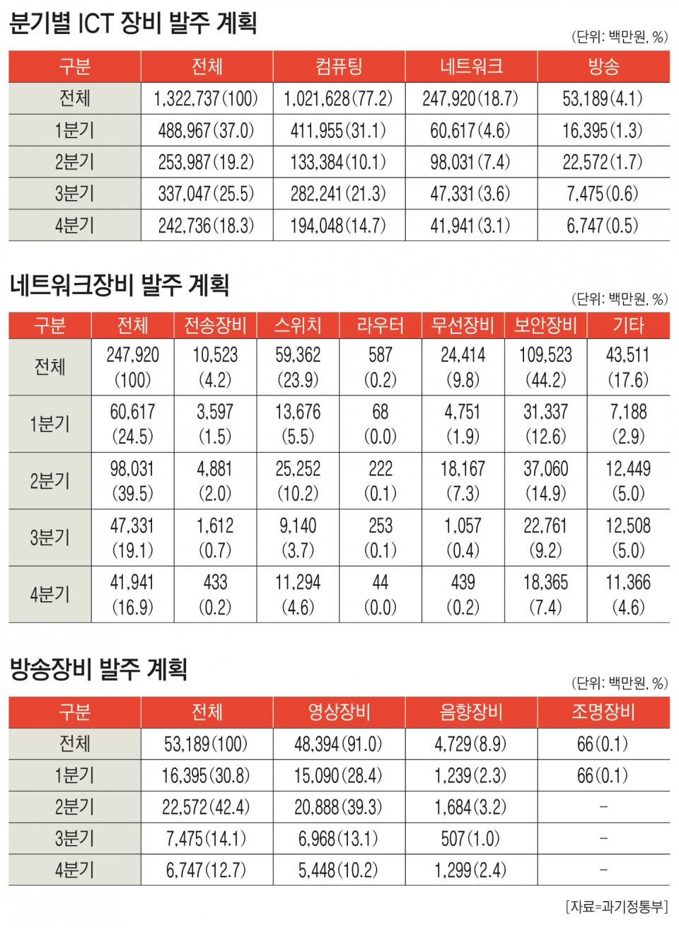 장비별로 계획을 보면, 컴퓨팅 장비의 경우 1조216억원으로 지난해 대비 2122억원(26.2%) 늘어났으며, 네트워크 장비의 경우 2479억원으로 116억원(4.9%) 증가했다. 반면 방송장비는 532억원을 발주, 전년 대비 64억원(10.8%) 감소했다.