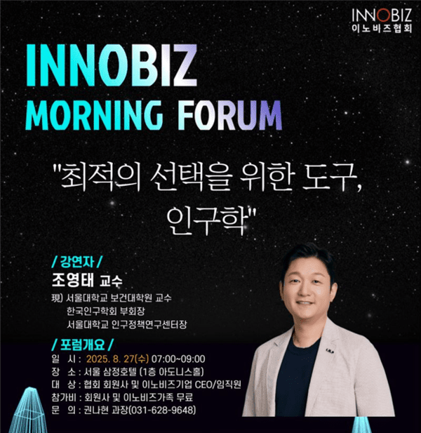 이노비즈협회(회장 정광천)는 오는 8월 27일 오전 서울 삼정호텔(아도니스홀)에서 ‘이노비즈 모닝포럼’을 개최하고, 조영태 서울대학교 보건대학원 교수를 초청해 ‘최적의 선택을 위한 도구, 인구학’이라는 주제로 특별 강연을 진행한다고 밝혔다.