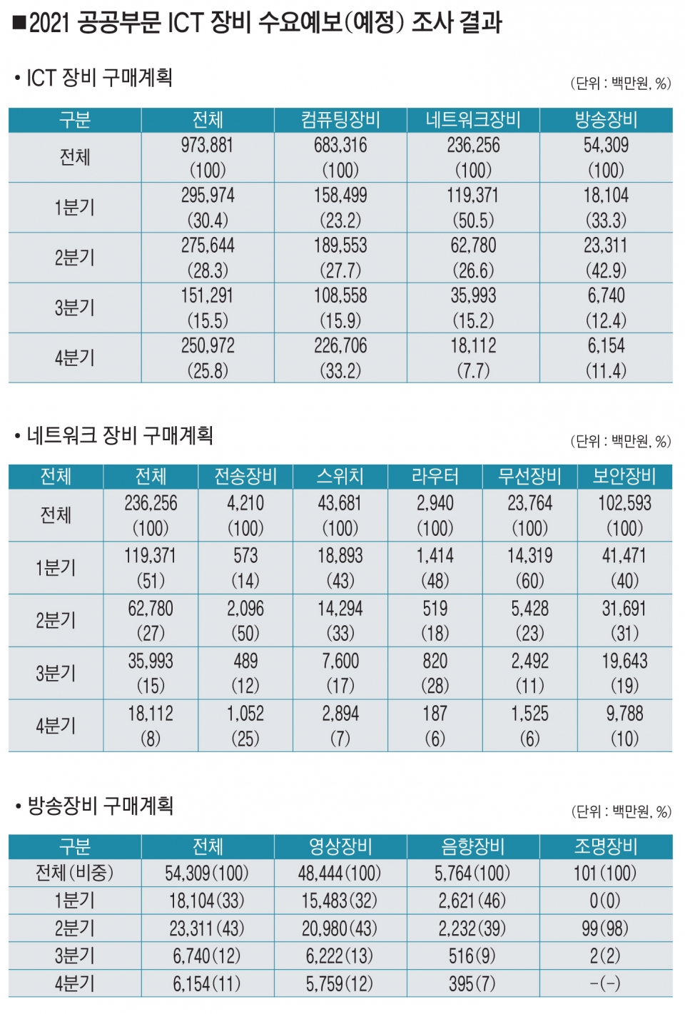 2021년 ICT장비 구매계획은 전년(9784억원) 대비 0.5% 감소한 9739억원으로 집계됐다. 세부적으로는 △컴퓨팅장비 6833억원(70.2%) △네트워크장비 2363억원(24.3%) △방송장비 543억원(5.5%) 순이다.