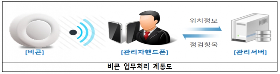 비콘은 블루투스를 활용한 근거리 무선통신장치로 실시간 위치정보 파악이 가능하다. 특히 비콘을 이용한 점검방식은 기존 NFC카드(초근거리 무선통신)를 사용한 점검방식의 단점을 보완한 점검 기술이다.