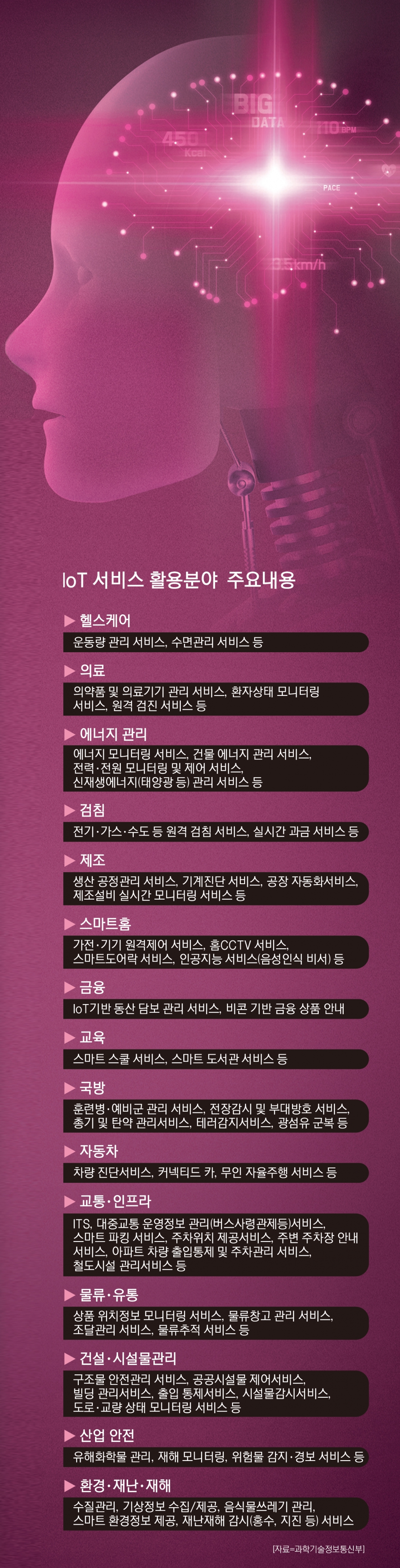 또한 △농림축산 △수산 △자동차 △교통·인프라 △항공·우주 △조선·선박 △관광 △스포츠·레저·오락 분야에서도 IoT서비스가 폭넓게 활용되고 있다. 이와 함께 △소매 △물류·유통 △건설·시설물관리 △산업 안전 △환경·재난·재해분야도 IoT 서비스 영역으로 빼놓을 수 없다.