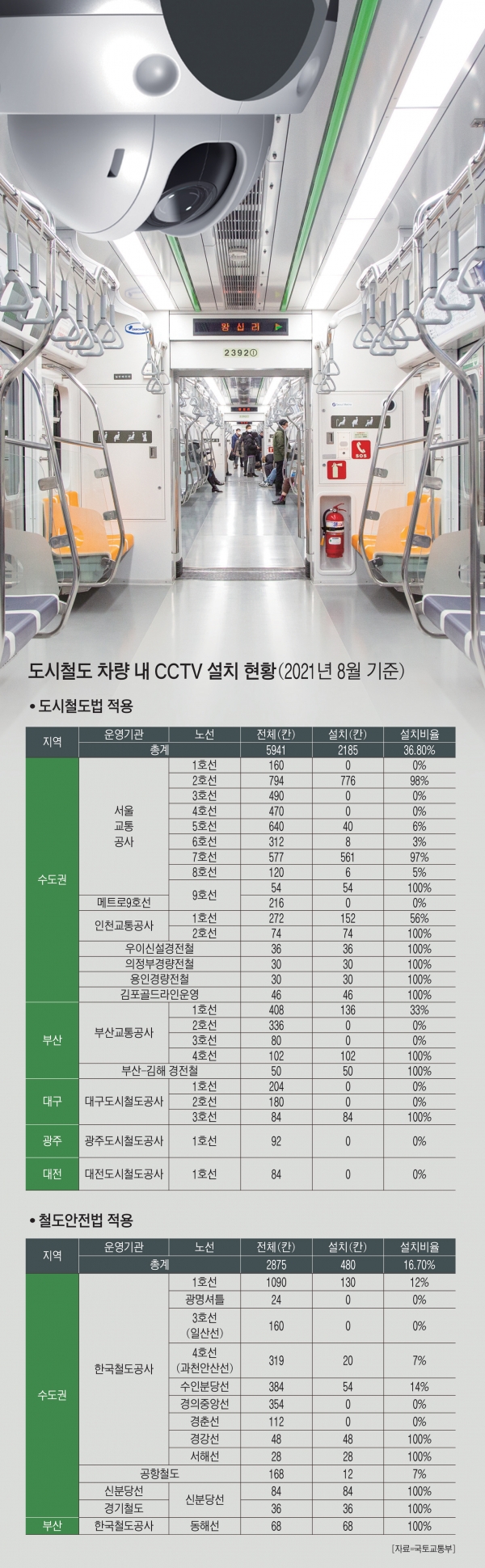 국토교통부에 따르면 도시철도법이 적용되는 서울교통공사·서울시메트로9호선·인천교통공사 등 12개 운영기관이 운행하는 전동차 5941량 가운데 객실 내부에 CCTV가 설치된 차량은 2185량으로 36.8%에 그쳤다.