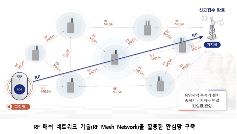 고정형은 집안 또는 점포 내 상시 비치해 버튼을 누르는 즉시, 사전에 등록된 위치정보(주소)가 통신 중계기를 통해 신고되는 방식이며, 중계기 활용 메쉬 네트워크 방식으로 휴대폰 없이도 사용 가능하며, 전력 소모도 적은 편이다.