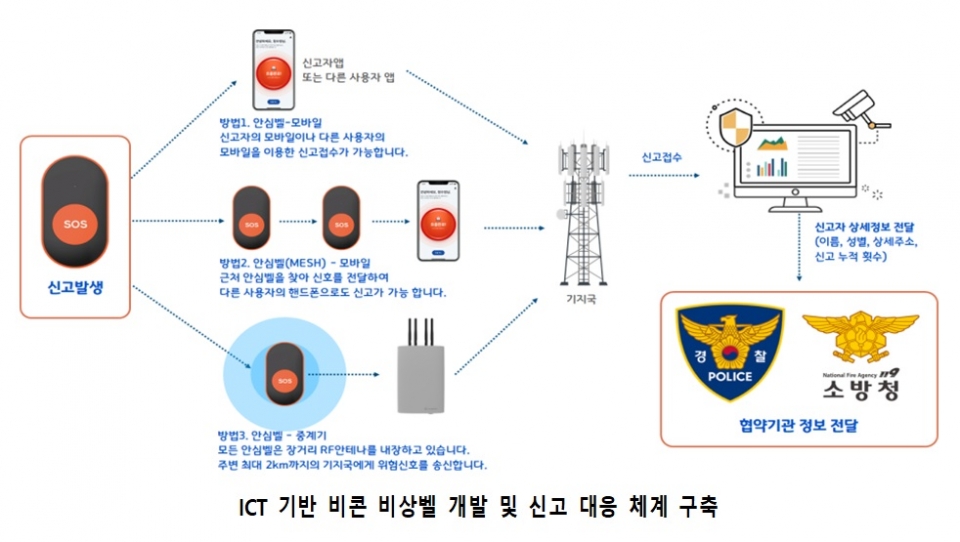 ‘비콘 비상벨 긴급 신고시스템’은 비콘 단말기에 사용자의 이름, 주소, 핸드폰번호 등 개인정보를 사전에 등록하고, 위급 상황 시 비상벨 버튼만 누르면 메쉬 네트워크 방식으로 연결된 무선주파수(RF)망, 와이파이 또는 핸드폰을 통해 자동으로 신고가 가능하며, 고정형과 휴대용 2가지 유형으로 구성된다.