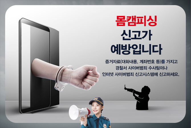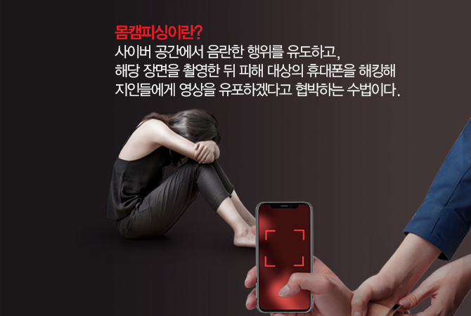 몸캠피싱이란 사이버 공간에서 성적호기심을 자극해 음란한 행위를 유도하고, 해당 장면을 촬영한 뒤 피해 대상의 휴대폰을 해킹해 지인들에게 영상을 유포하겠다고 협박하는 수법이다. 현재 청소년을 비롯한 20대 남성 및 중장년층까지 몸캠피싱 피해자가 발생하고 있다.
