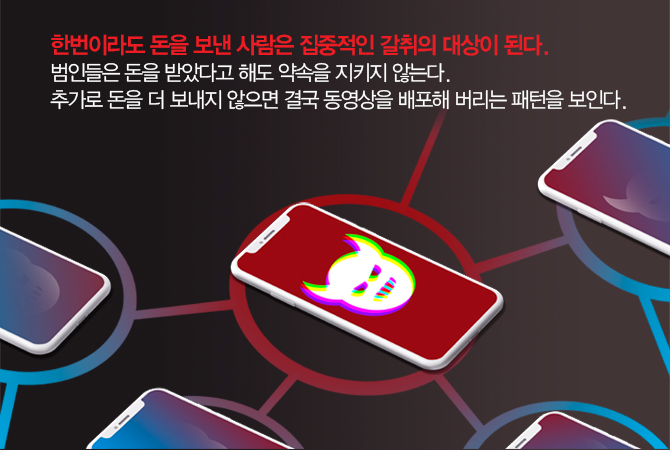 범죄 일당은 ‘몸캠 유포’를 빌미로 피해자에게 수백만 원을 요구한다. 만약 이때 순순히 돈을 건네지 않는다면 연락처 중 일부에게 시범 삼아 먼저 유포해 겁을 준 뒤 돈을 받아낸다. 이들의 특징은 한번 입금했다고 끝이 아니라 수 차례에 걸쳐 협박과 갈취를 반복한다는 점이다.