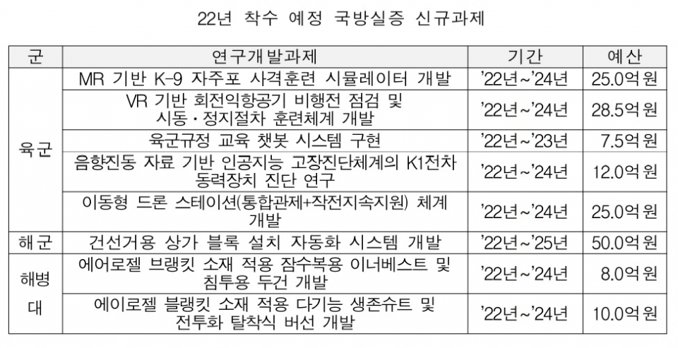 먼저 자율주행·로봇, 사이버, 가상현실·혼합현실(VR·MR) 등 4차 산업혁명 핵심기술 7개 분야 민군기술개발에 376억원 규모를 투자하고, 신기술의 국방분야 활용성 및 민수사업화를 제고하기 위해 국방실증을 통해 트랙레코드 확보를 지원한다.