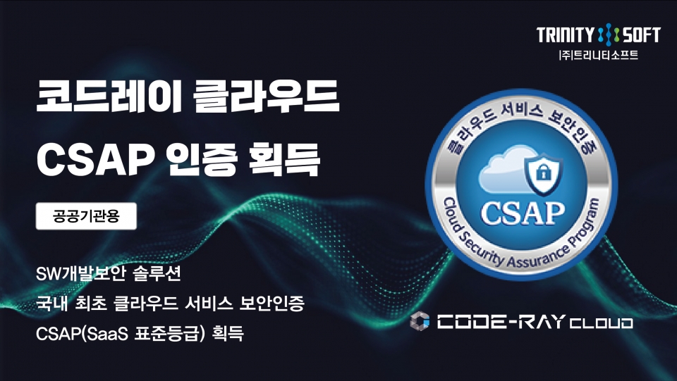 소프트웨어 개발 보안 전문 업체 트리니티소프트(대표 김진수)가 한국인터넷진흥원(KISA)으로부터 시큐어코딩 솔루션인 ‘코드레이’에 대한 클라우드 서비스 보안인증(CSAP)을 획득했다고 밝혔다. 시큐어코딩 솔루션 중 SaaS 표준등급으로 인증을 받은 최초의 제품이다.