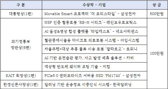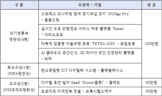 또 이번 전시회에서는 국내 혁신 ICT기술을 개발한 기업의 사기를 진작하고 ICT 분야 신성장동력 창출과 관련 산업 저변 확대를 촉진하기 위한 ‘대한민국 ImpaCT-ech 대상’과 WIS 전시 참가 기술제품 중 가장 주목받을 제품과 우수기술을 선정해 수여하는 ‘WIS 혁신상’ 시상식을 함께 진행했다. 2022 대한민국 ImpaCT-ech 대상에서는 업계 최초로 오토포커싱 기능과 AI 스피커를 탑재한 초고화질 경량화 프로젝터 ‘삼성전자 더 프리스타일’이 대통령상을 수상하는 등 총 9개 제품·기술에 수상의 영광이 돌아갔다. WIS2022 혁신상에서는 과학기술정보통신부장관상을 수상한 ‘스트레스 모니터링 원격 공기주입 조끼’ 등 7개 제품이 수상의 영예를 안았다.