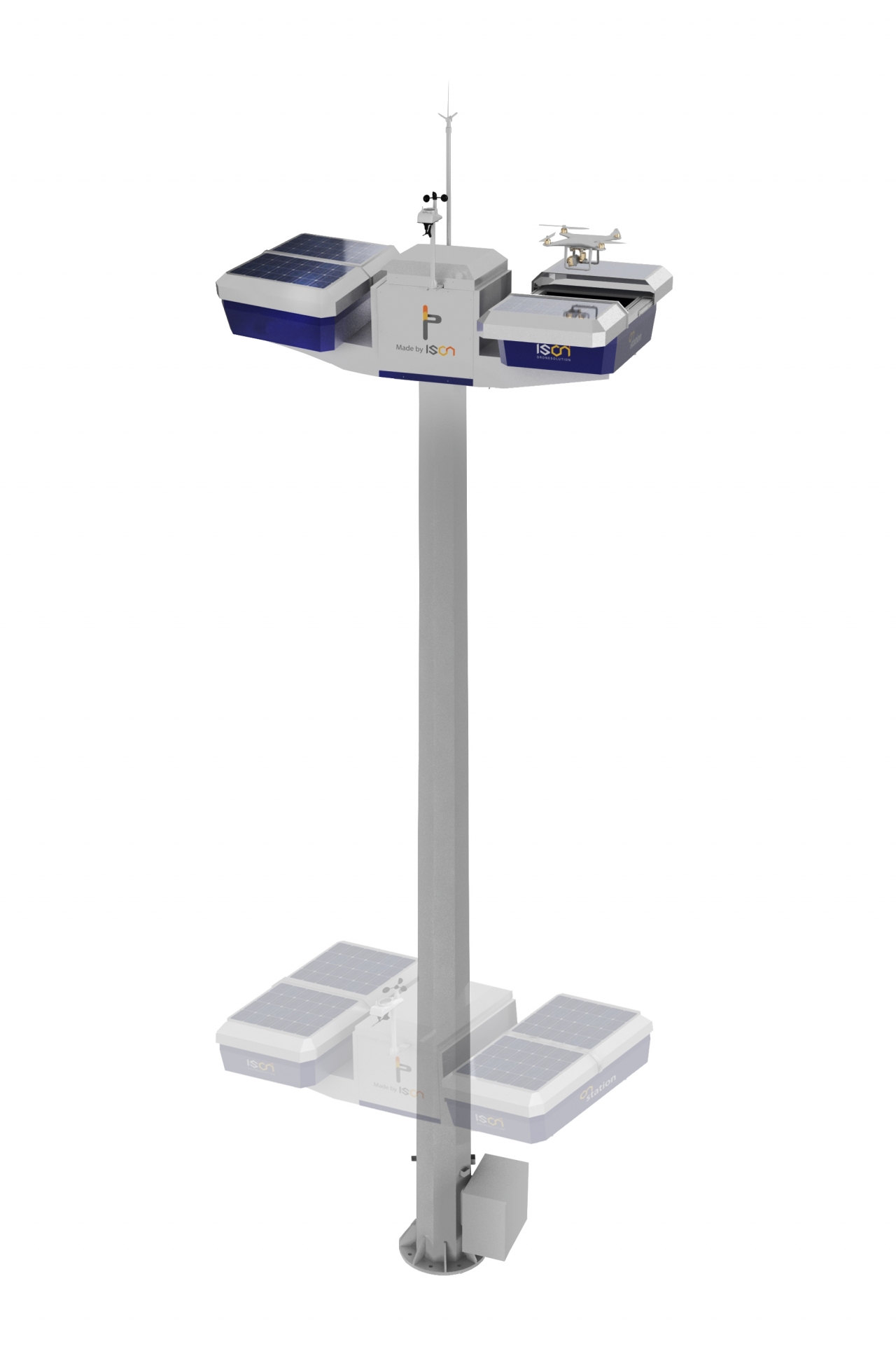 10여 미터 높이의 지상에 설치할 수 있는 이스온의 ‘ON STATION’은 특수 충전 핀을 드론 다리에 부착함으로써 국내외 모든 제조사의 드론을 충전할 수 있다.