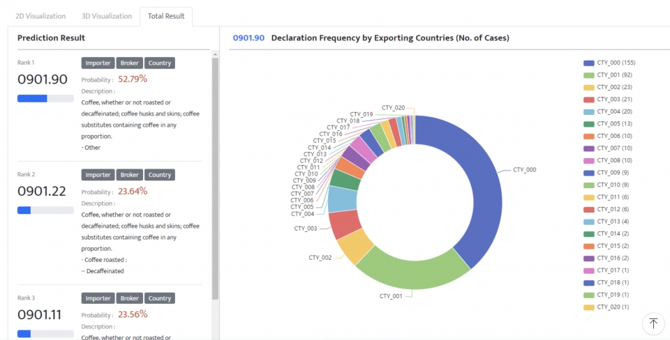 또한 세관은 해당 물품으로 신고된 HS-Code의 비중을 수입업자, 관세사 그리고 수출국가 별로 통계정보를 확인할 수 있다.