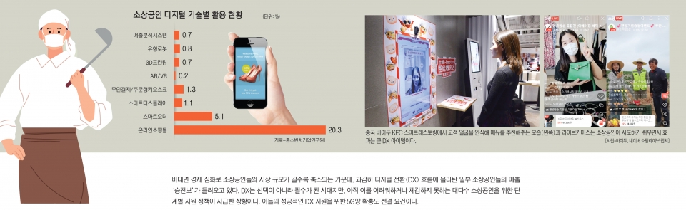 비대면 경제 심화로 소상공인들의 시장 규모가 갈수록 축소되는 가운데, 과감히 디지털 전환(DX) 흐름에 올라탄 일부 소상공인들의 매출 ‘승전보’가 들려오고 있다. DX는 선택이 아니라 필수가 된 시대지만, 아직 이를 어려워하거나 체감하지 못하는 대다수 소상공인을 위한 단계별 지원 정책이 시급한 상황이다. 이들의 성공적인 DX 지원을 위한 5G망 확충도 선결 요건이다.